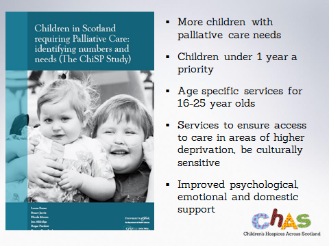 Some of the most exciting developments have to be CHAS's involvement in an international children's palliative care network (www.icpcn.org.uk) meeting in Durban in May of this year, and to be able to say that the Children in Scotland requiring Palliative Care (The ChiSP Study, 2015) is still being considered in detail. It remains the only study in the world offering prevalence and numbers of children with palliative care needs for one whole country: Scotland. It has allowed us to be portrayed in a very positive sense, but also has allowed CHAS to be able to offer a view of children's palliative care across the rest of the UK and Eire, but well beyond that as well.